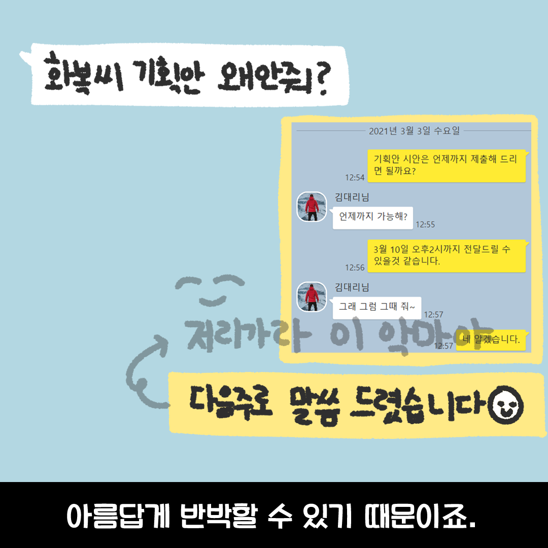 ๋ฌด๋ณด๊ณ ํ ์น๋์ด ๋จ์ด์ง๋ฉด, ํญ์ ๋ค์ ํ๋ฒ ์์ฝํด์ ์์ฌ์ ๋ง์ ์ฌํ์ธํฉ๋๋ค. "์ ๊ฐ ์ด๋ ๊ฒ ํ๋ฉด ๋๋ค๋ ๋ง์์ด์์ฃ ?"๋ฑ์ผ๋ก ์ฑ